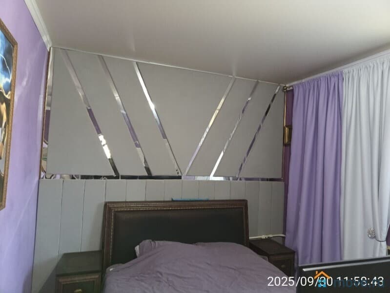 ? Спальня с удобной кроватью, прикроватными тумбочками и встроенным шкафом для хранения и мягкими панелями с зеркальными вставками.